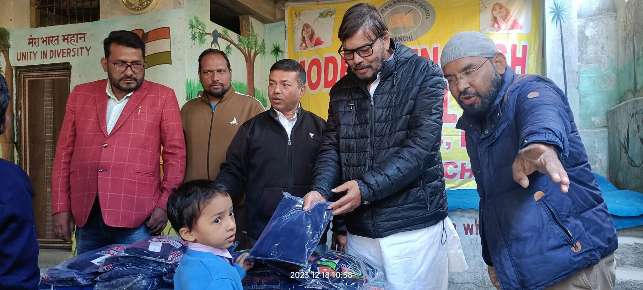 Ibrar Ahmed distributing school uniforms to a childIbrar’s roots run deep in culture. As the state president of IPTA, he carried forward campaigns for communal harmony through cultural programs. Along with folk artists, he produced a 51-episode documentary series titled “Johar Jharkhand,” which was telecast on Doordarshan.