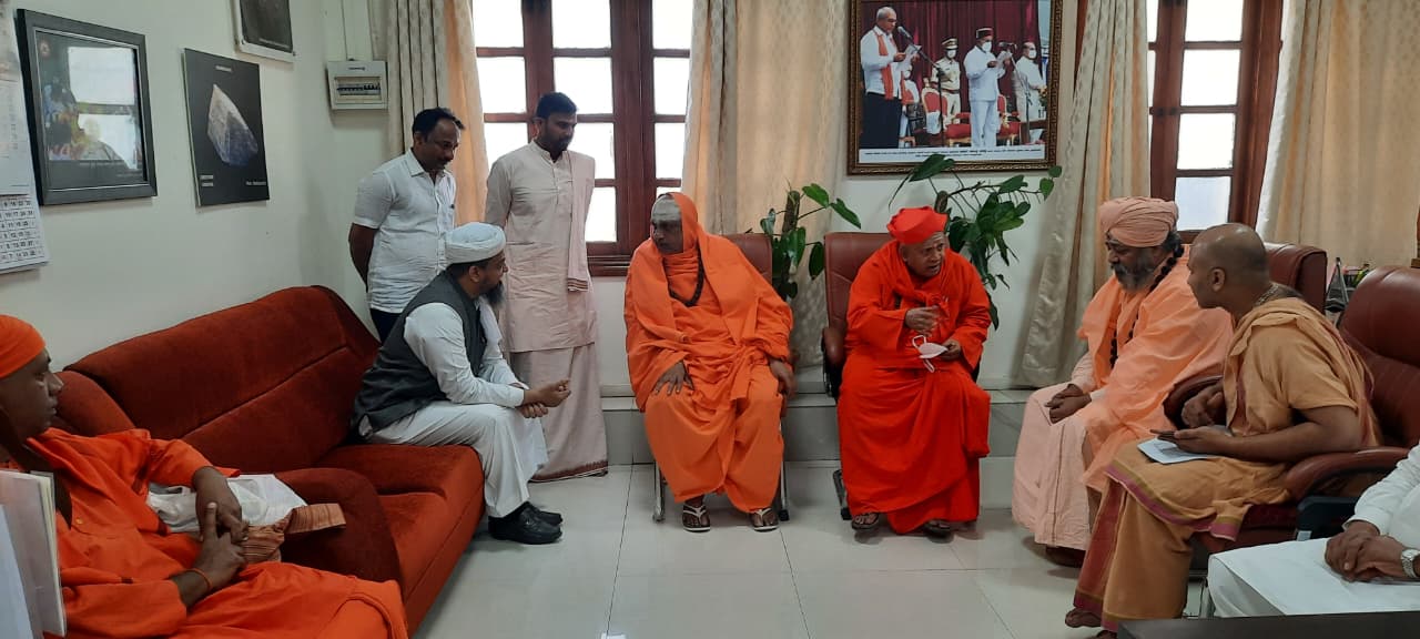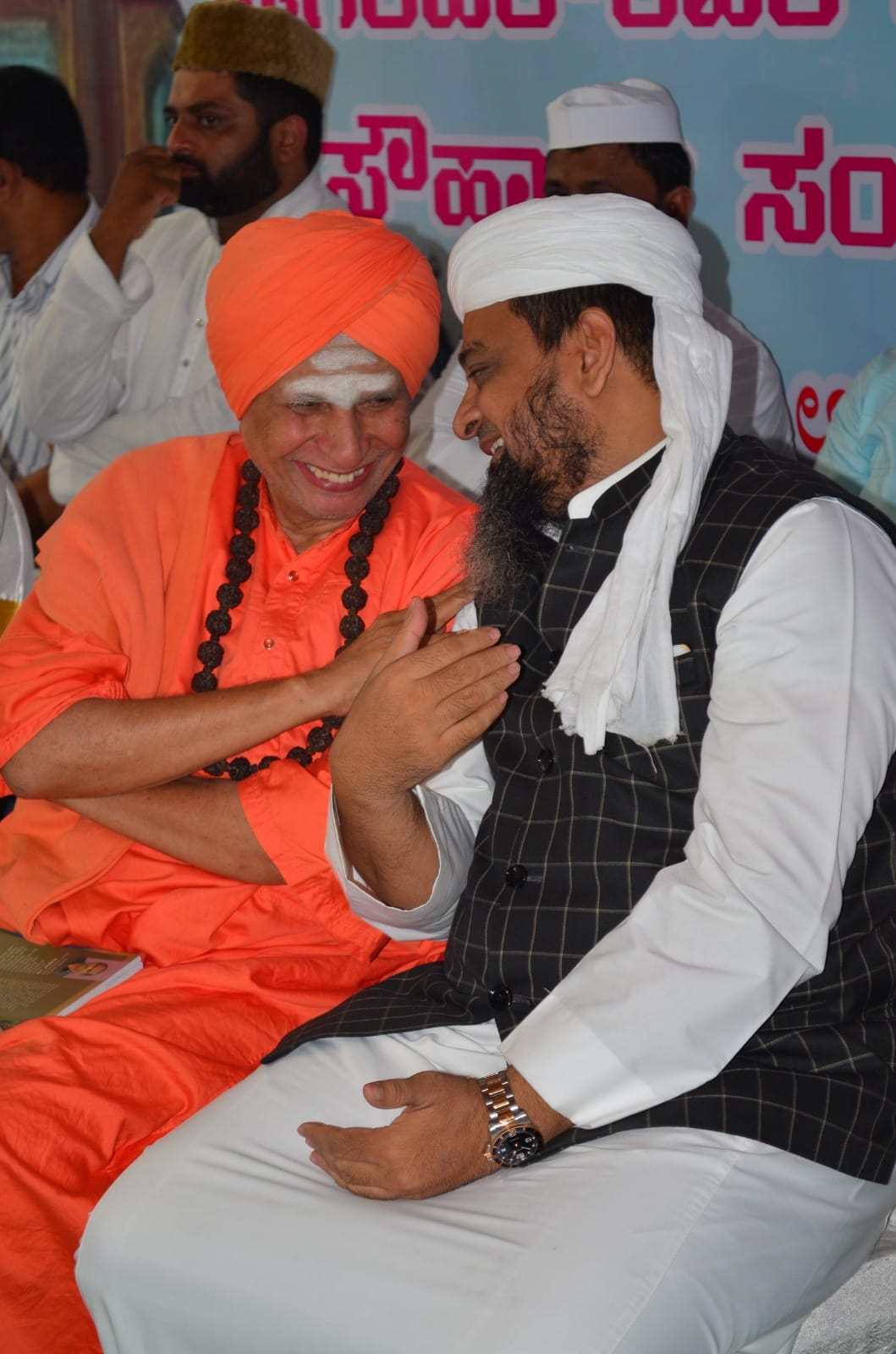 Maulana Maqsood Imran Rashadi meeting Swami Belimath Sri Shri Udhay Ji during the grand Milad-un-Nabi gathering