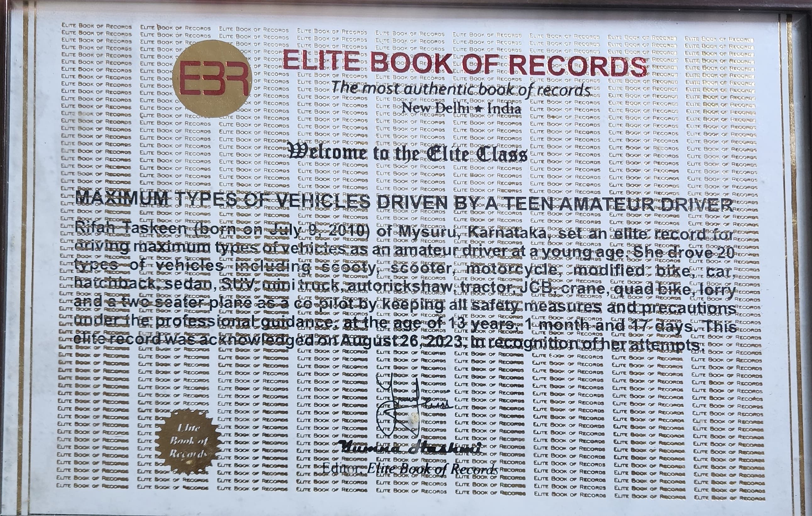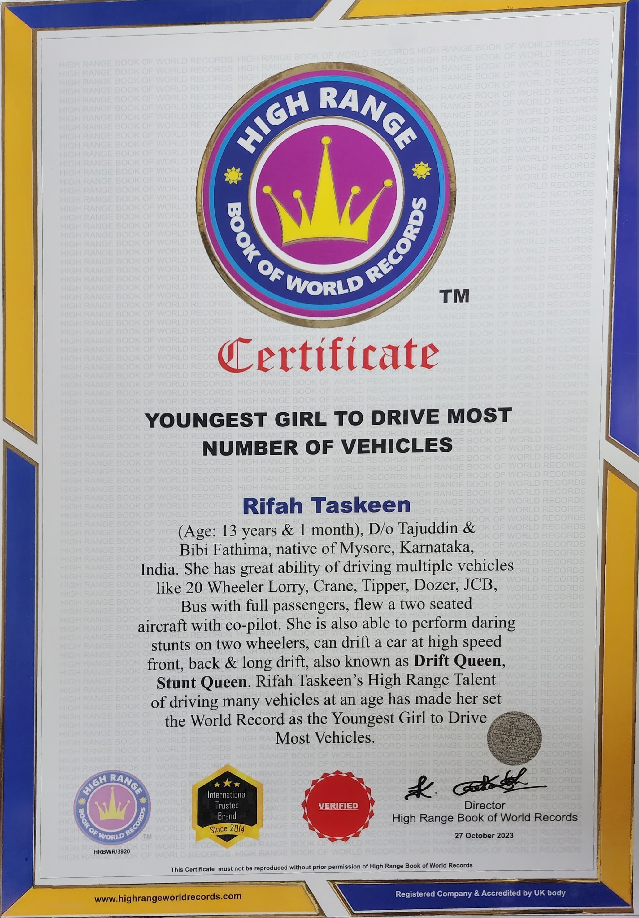 Through brand ads and promotions, she amplifies her impact, showing talent's limitless power.Holder of seven world records—Golden Book of World Records, Elite Book of World Records, High Range Book of World Records, India Book of World Records, Asia Book of World Records, Worldwide Book of World Records, and Wonder Book of World Records—Rifah commands vehicles like no other: bikes, a car-sized lengthy bike, JCBs, tippers, dozers, road rollers, cranes, cars, buses, SUVs, and even a plane at eight.