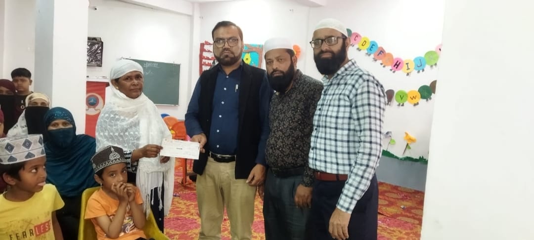 Tanveer Ahmed giving a cheque to a needy woman