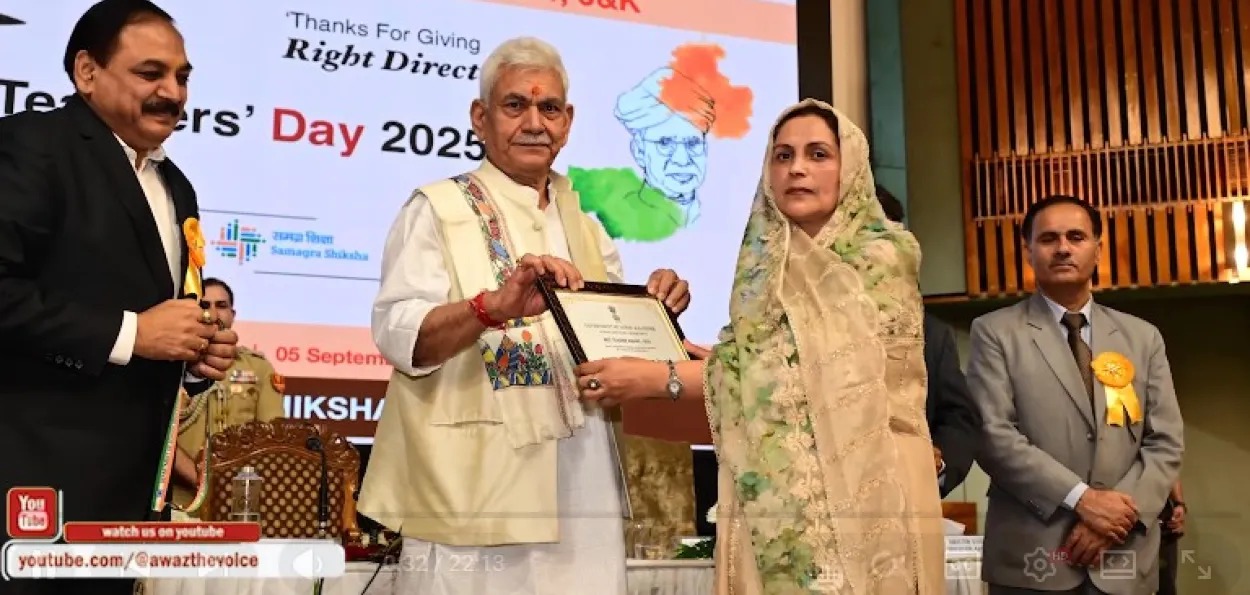 Irfana Tabassum, receiving the Best Teacher award from LG Manoj Sinha