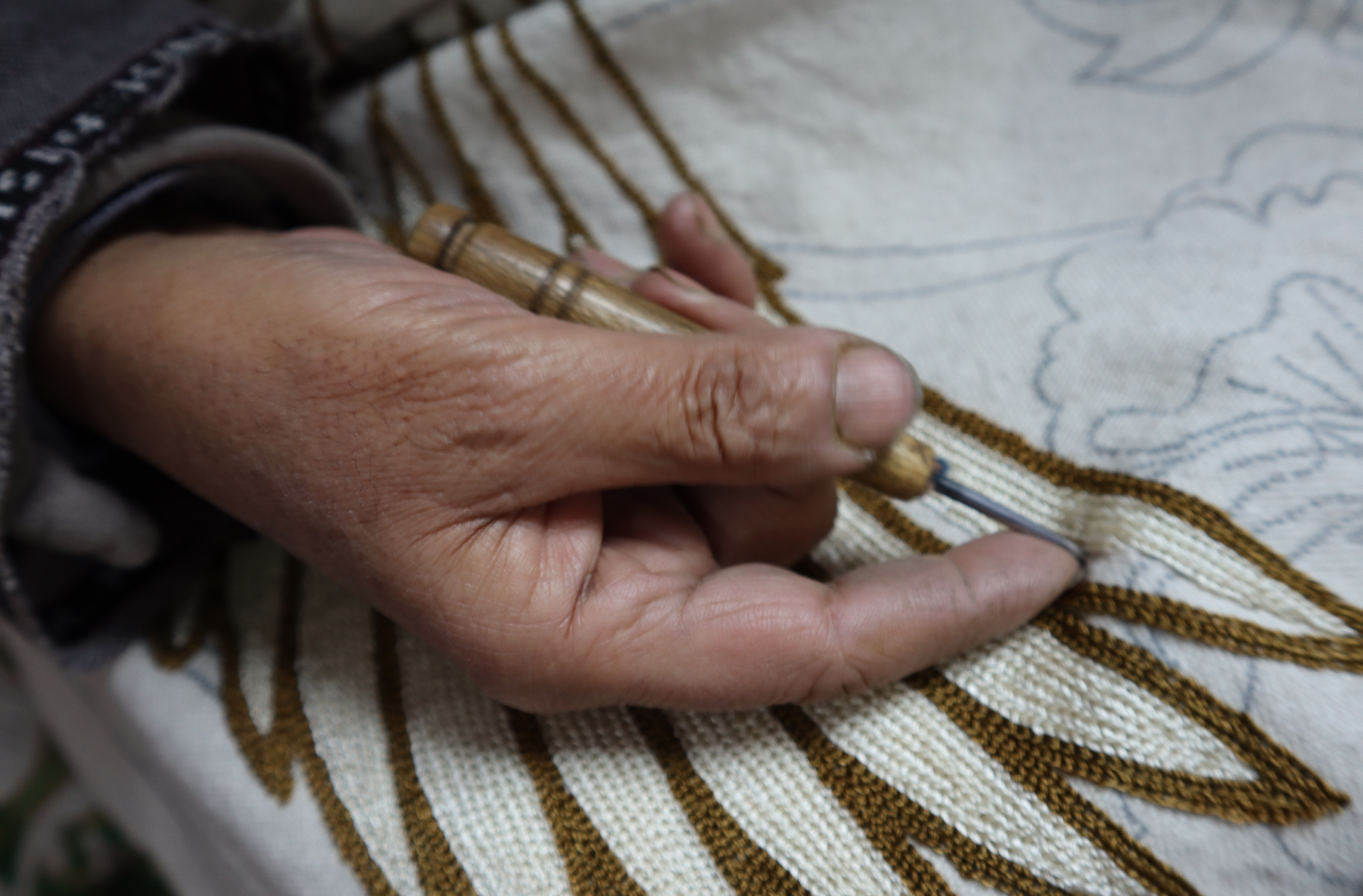 Mohammad Shafi Mir has been creating patterns with a needle and golden thread on garments like OPheren, kurta, shawls, and sarees, for over five decades. He has set up his unit near the shrine of Shah-e-Hamadan or Khanqah-e-Moalla, downtown Srinagar. “It is a laborious work where you needle your way to success,” he says.
