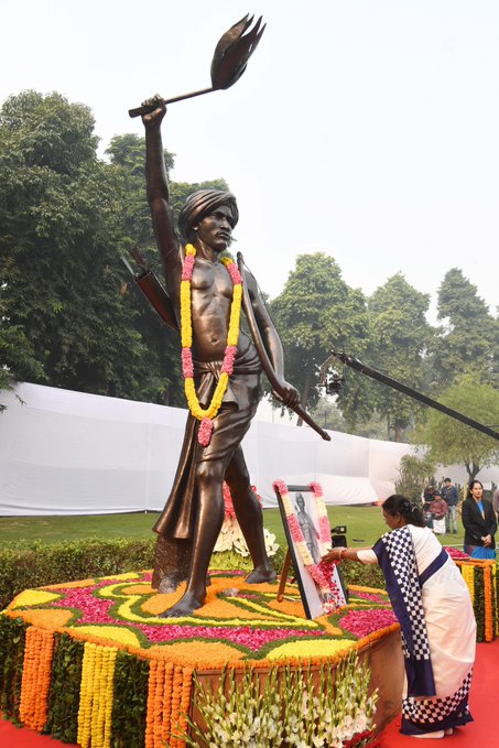 President Droupadi Murmu offering flowers at the statue of Birsa Munda