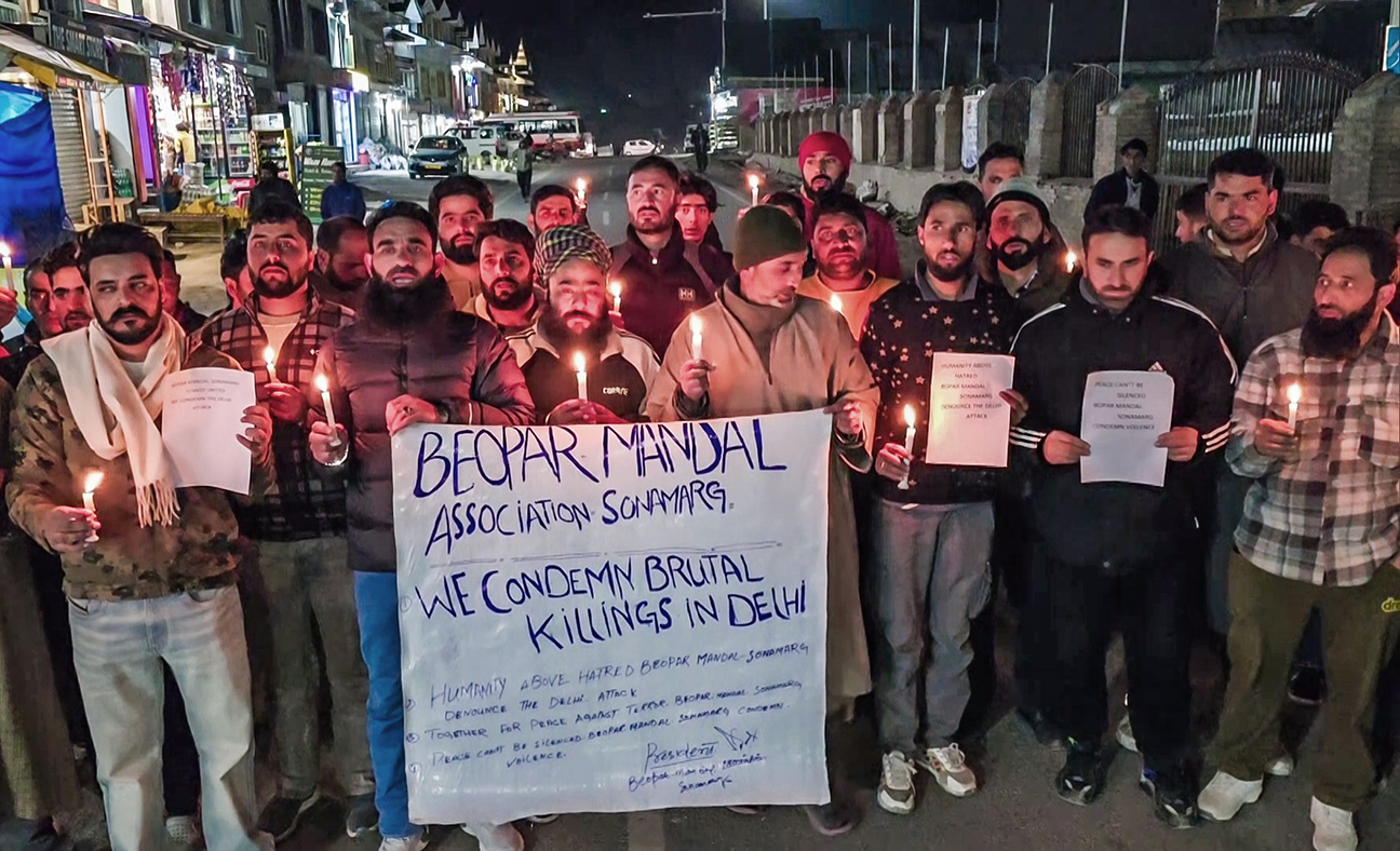 In a show of solidarity with the victims of the Delhi car blast, the Traders and Beopar Mandal Association of Sonamarg of Jammu and Kashmir organised a candle march on Tuesday.