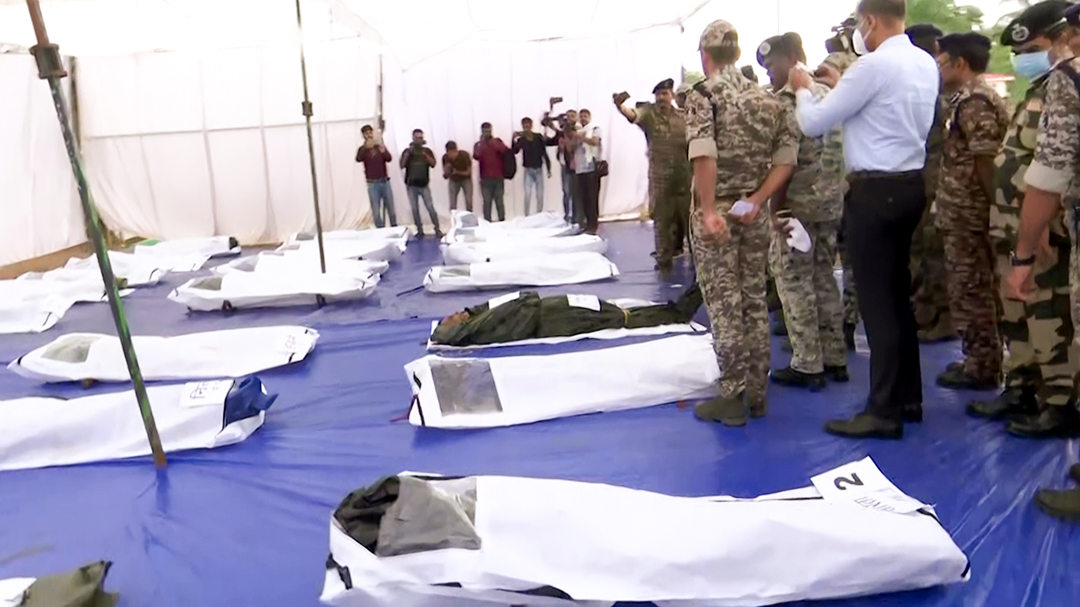 Police inspecting bodies of 27 Naxals killed by DRF in Abujmad forest