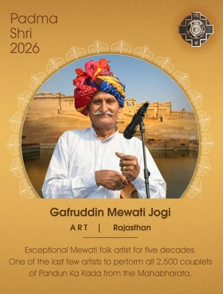 Ghaffaruddin Mewati Jogi is a renowned folk artist from Bharatpur, Rajasthan, who, as a master of the Bhapang instrument and a unique storyteller of 'Pandun ka Kada' (Mahabharata), has preserved this for over 60 years, with more than 2,500 couplets. Gafaruddin, an internationally renowned folk artist and bhapang player from Deeg district in Rajasthan, will be awarded the Padma Shri. He is the only living singer of Pandun ka Kada, with over 2,500 couplets memorised, and has given global recognition to Indian folk heritage.