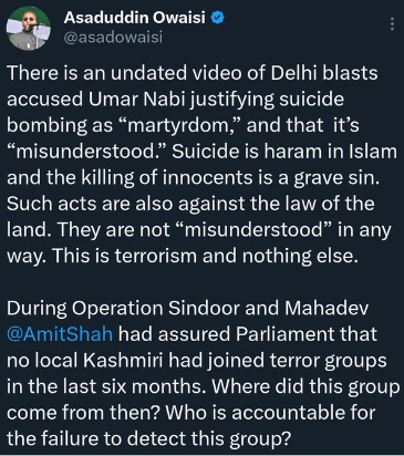"There is an undated video of Delhi blasts accused Umar Nabi justifying suicide bombing as "martyrdom," and that it's "misunderstood." Suicide is haram in Islam and the killing of innocents is a grave sin. Such acts are also against the law of the land. They are not "misunderstood" in any way. This is terrorism and nothing else," the AIMIM Chief said.