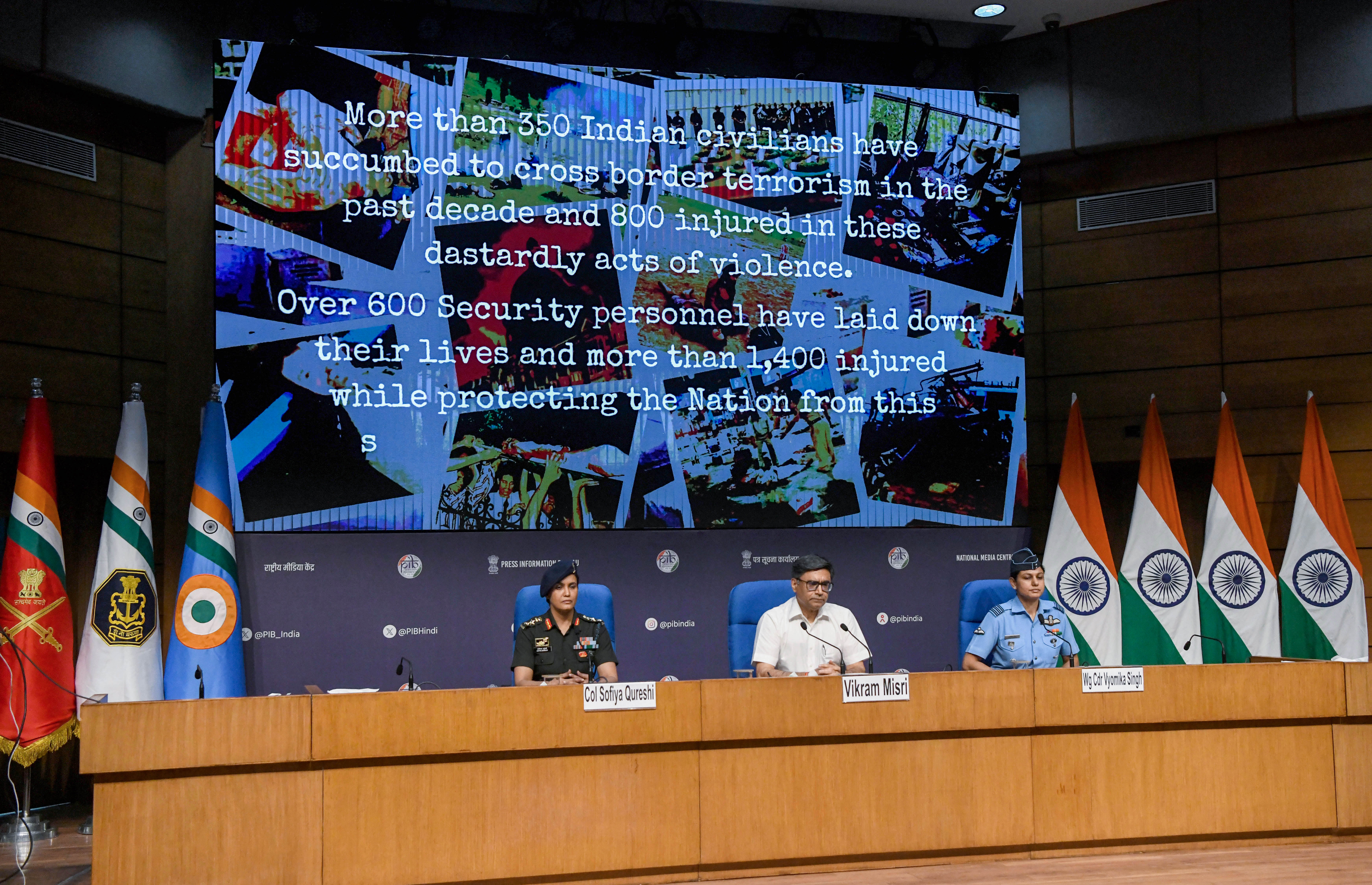 Col Sofiya Qureshi, Foreign secretary Vikram Misri and Wg Cdr Yvomika Singh briefing media on Operation Sindoor