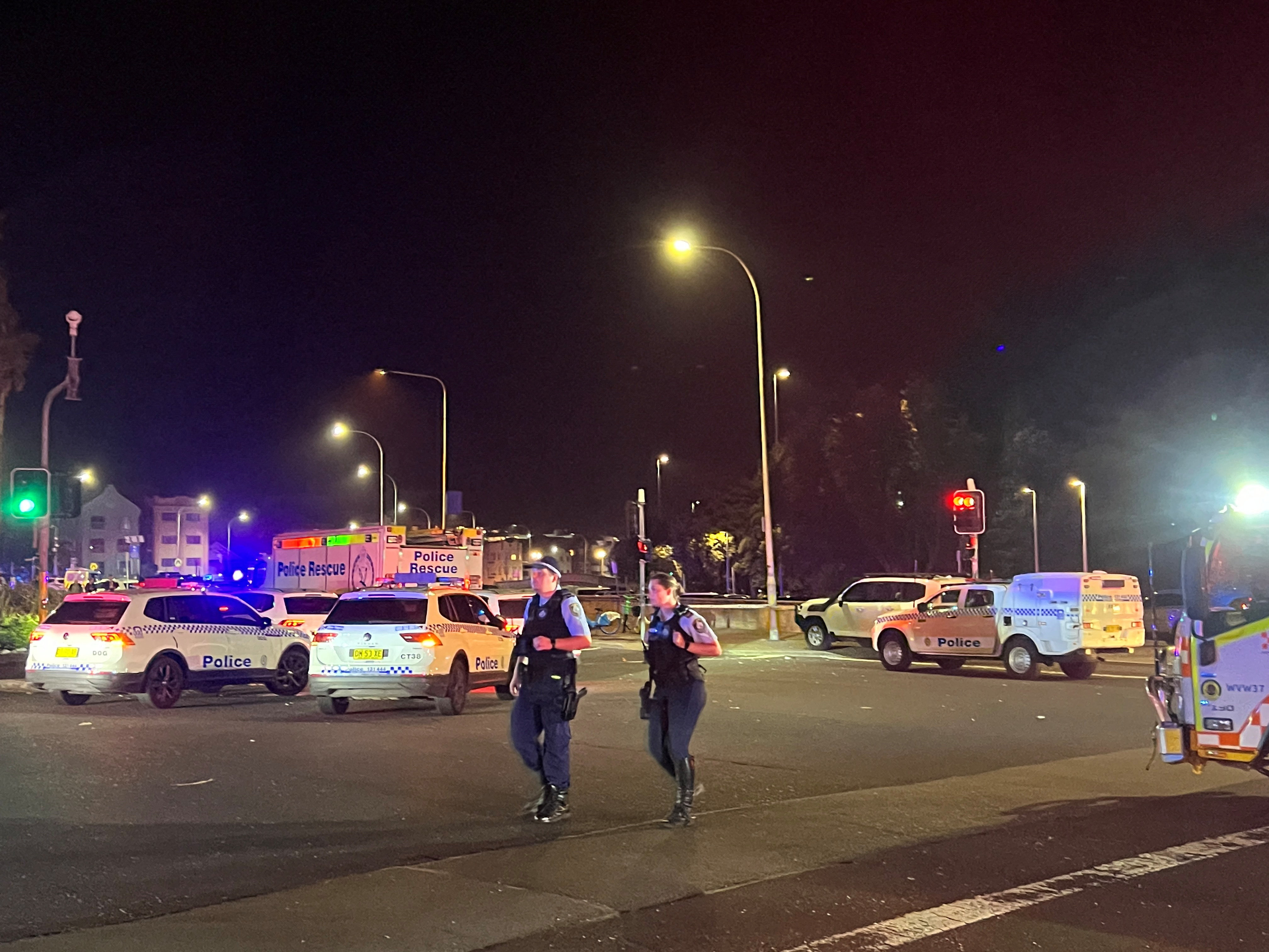 Poilice patrolling around site of terrorist stike at Bondi beach in Australia