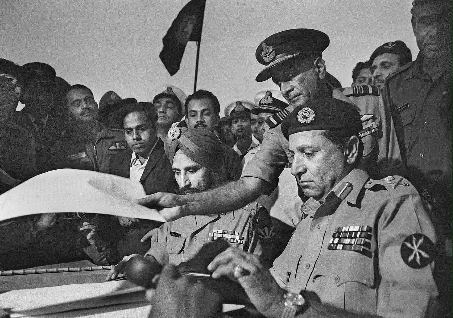 Gen A K Niazi signing the surrender document before Lt Gen Jagjit Singh Aurora