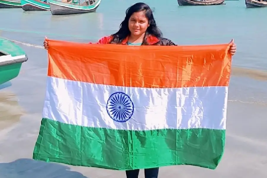Taherina Nasreen holding Indian flag after accomplishing a challenge