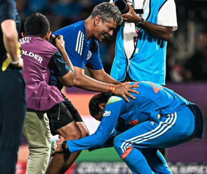 Captain Harmanpreet Kaur touching the feet of coach Amol Majumdar after winning the World Cup