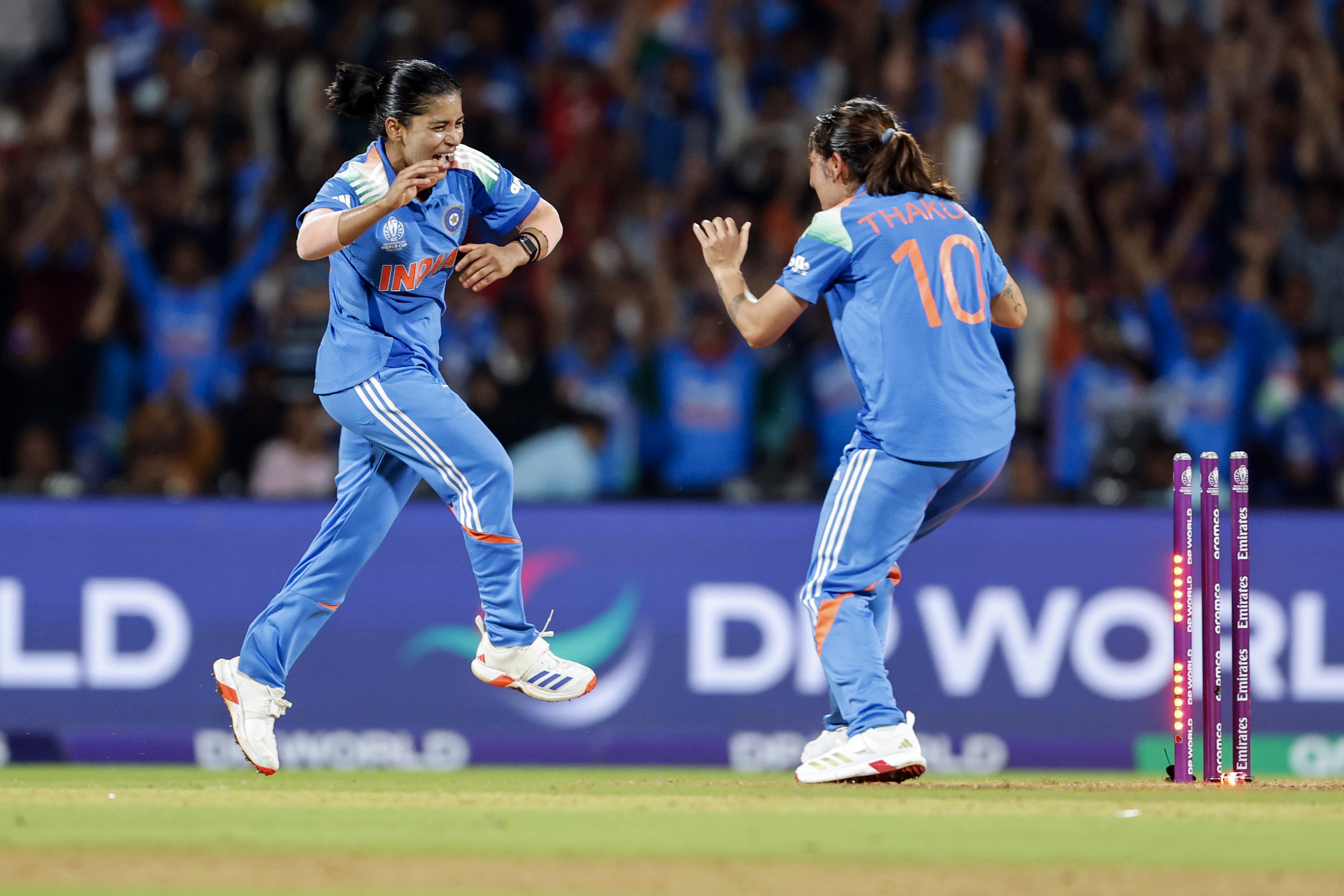 Amanjot Kaur and Renuka Singh Thakur celebrate the wicket of Tazmin Brits