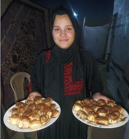 A woman living in a tent celebating the arrival of peace in Gaza