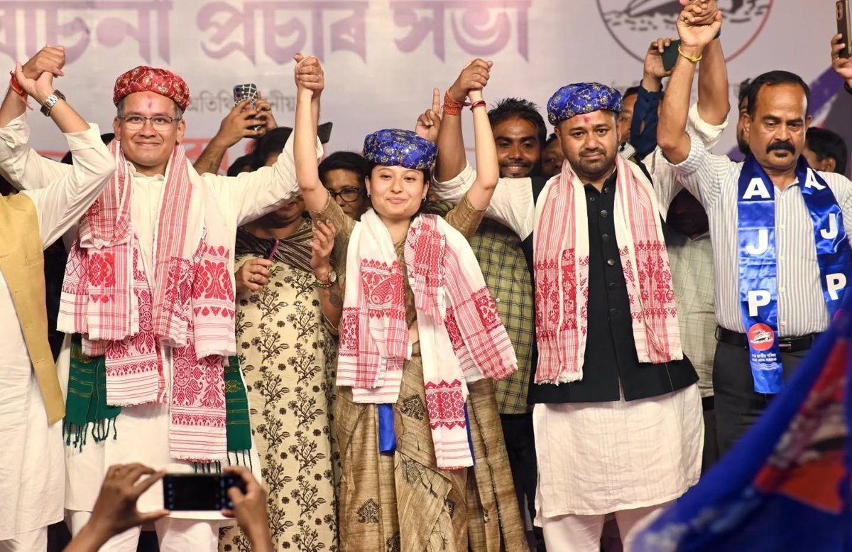 Assam Congress leader Gaurav Gogoi and AJP chief Lunrin Jyori Gogoi campaiging for Kunki Chowdhury in Guwahati
